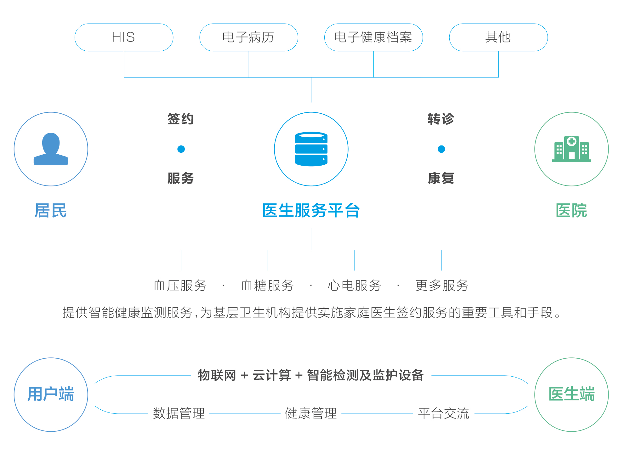 医生服务平台利用互联网+物联网技术及智能化健康检测硬件产品,可与医院His系统对接,实现病患健康信息的多机构连网,便于对患者的院内病案管理及与院外健康管理服务的打通,极大扩展医院和医生的服务能力。
